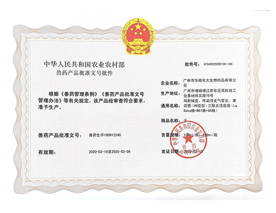獸藥生產許可證:(2022)獸藥生產證字19091字
