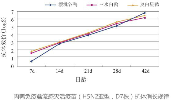免疫后抗體水平高、持續時間長,快大型肉鴨、肉鵝經一次免疫,平均抗體水平可達5log2以上;種鴨及種鵝經3次免疫后,平均抗體水平可達10log2以上。