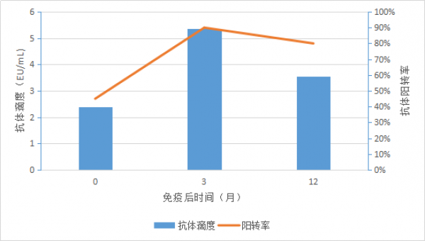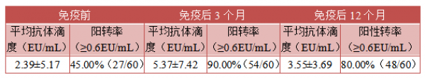 免疫前0天、免疫后3個月和6個月隨機采集免疫犬的血液,分離血清,以ELISA方法測定犬的狂犬病抗體。結果顯示,免疫前僅有27犬的抗體滴度達到或超過0.6 EU/mL,抗體陽轉率僅為45.00%,平均抗體滴度2.39EU/mL。免疫3個月后,抗體陽轉的犬達到54,抗體陽轉率提高到90.00%,平均抗體滴度5.37EU/mL。免疫12個月后,抗體陽轉的犬仍有48,抗體陽轉率維持在80.00%,平均抗體滴度為3.55EU/mL(表1、表2和圖1