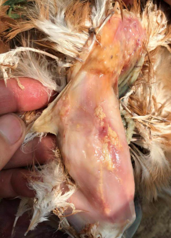 腿肌注射后容易損傷坐骨神經,嚴重的會出現癱瘓;另外,消毒不嚴格可能引起注射部位感染,部分雞出現癱瘓。