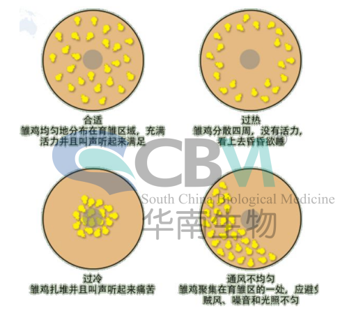在實(shí)際飼養(yǎng)過程中。要根據(jù)情況看雞施溫。判定溫度是否適宜還要取決于雞群狀態(tài)。在正確的溫度下雞群散開,雛雞一般20—30只為一個(gè)群體,且不同群體間的雛雞相互運(yùn)動(dòng),叫聲清脆。溫度過高,雛雞沒有叫聲,張口喘氣,頭和翅膀下垂,遠(yuǎn)離熱源。溫度過低,雛雞在靠近熱源處扎堆,發(fā)生悲鳴的叫聲。賊風(fēng)、光照不均、外界噪音也會(huì)引起扎堆情況,要認(rèn)真觀察,加以區(qū)分。