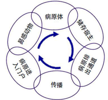病原微生物必須有足夠數量與易感宿主家禽接觸,才能使該病原引起的疾病在易感家禽間擴散。為了感染家禽,病原微生物必須與動物有足夠的接觸(傳染壓力)。同時,病原體必須能具有傳染性才能可通過直接接觸(雞與雞)和/或間接接觸(經由污染的設備、環境等)和/或通過攜帶者進行傳播。蟲類、鳥類、其他動物或一些有機物可作為某些病原的儲存宿主(例如飼料和糞水),使病原持續存在。對傳染鏈(圖1)的一個或幾個環節有實質性影響的行為都會降低疾病傳播的風險。