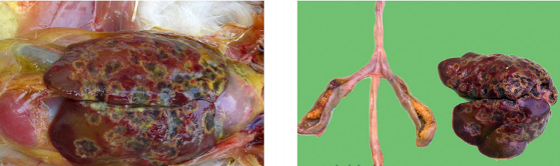 5、禽弧菌性肝炎:肝臟腫大,慢性病例在肝臟的表面和實質內有黃色、星芒狀的小壞死灶或布滿菜花狀的大壞死區,急性病例肝臟被膜脫落肝臟出血,腹腔內有多量血水。