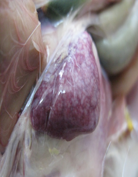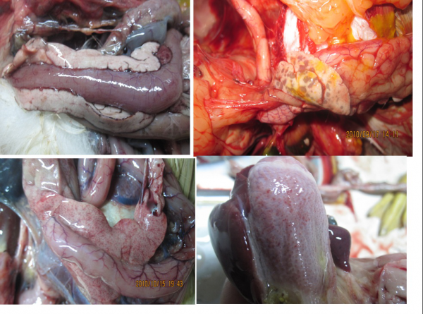 心內外膜出血;腦膜水腫、出血;肺臟先是一側出血發黑,后兩側出血發黑;肝臟腫大,顏色多數發黃發白,類似腺病毒;脾臟腫大、出血,似大理石樣花斑;腎臟腫大、出血,似花斑樣;有的腺胃乳頭出血;胰臟出血。