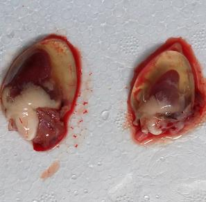 2)心包積液綜合征:剖檢病變主要表現為心包腔內有黃色清亮水樣或膠凍樣液體,心肌柔軟,有壞死點。肝臟腫大、質脆易碎、有壞死灶;脾臟腫大;肺水腫、充血